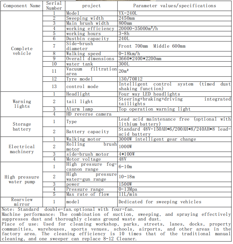 สถานที่ใช้งาน: ใช้สำหรับทำความสะอาดโรงงาน สวนสาธารณะ ถนน เลน ท่าเรือ ชุมชน โกดัง สนามกีฬา โรงเรียน สนามบิน และพื้นที่อื่น ๆ ในบริเวณโรงงาน ประสิทธิภาพการทำความสะอาดเป็น 10 เท่าของการทำความสะอาดด้วยตนเองแบบเดิม และเครื่องกวาดหนึ่งเครื่องสามารถแทนที่น้ำยาทำความสะอาด 8-12 ได้