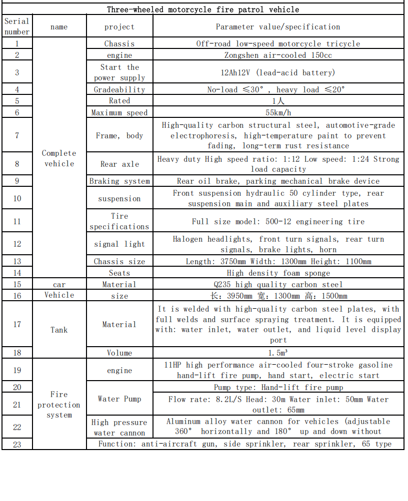 เมื่อพิจารณาถึงถนนในชนบทระดับต่ำและระยะทางไกลจากสถานีดับเพลิง รถจักรยานยนต์ดับเพลิงสามล้อสามารถใช้เป็นอุปกรณ์หลักของหน่วยดับเพลิงมืออาชีพในเขตเมืองได้ พวกเขาสามารถบรรทุกสิ่งของได้มากกว่ารถสองล้อ และสามารถปรับให้เข้ากับสภาพถนนที่ซับซ้อนได้ดีกว่ารถดับเพลิงสี่ล้อ โดยคำนึงถึง "การส่งกำลังตำรวจในบริเวณใกล้เคียงและการกำจัดอย่างรวดเร็ว"